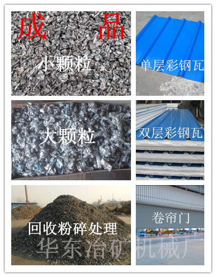 金屬彩鋼瓦破碎粉碎后的物料光亮干凈,便于運輸,減少了運輸成本,鋼廠煉鋼時收得率提高,經(jīng)破碎粉碎后的廢金屬材料,銷路很好,利潤空間提高,練出的鋼水與投入的廢鋼比例高(產(chǎn)出比高),爐內(nèi)的化學(xué)成分穩(wěn)定、受熱均勻、鋼水重磷、硫含量低、加料密度增加,加料次數(shù)減少,爐內(nèi)耐火材料襯里壽命延長,冶煉時空氣污染減少、操作容易、耗能降低、利潤空間大。